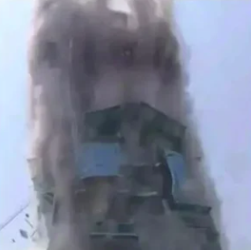 สองเฟรมแรกแสดงให้เห็นช่วงเวลาที่น่าตื่นเต้น เมื่ออาคารหลายชั้นพังถล่มลงมาเป็นกลุ่มฝุ่นขนาดใหญ่