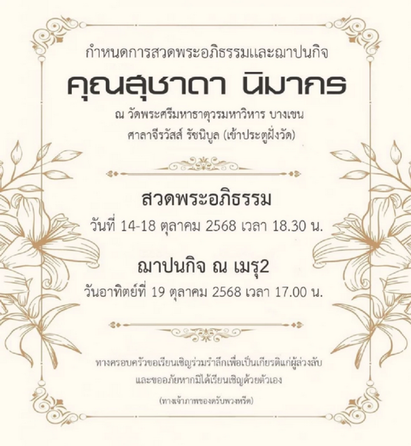 สวดอภิธรรม วันที่ 14-18 ตุลาคม 2568 เวลา 18.30 น. ฌาปนกิจ ณ เมรุ 2 วันอาทิตย์ที่ 19 ตุลาคม 2568 เวลา 17.00 น. ทางครอบครัวขอเรียนเชิญร่วมรำลึกเพื่อเป็นเกียรติแก่ผู้ล่วงลับและขออภัยหากมิได้เชิญด้วยตนเอง