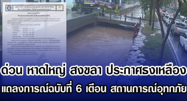 วันที่ 18 ธ.ค.2568 เทศบาลนครหาดใหญ่ ได้เผยแพร่แถลงการณ์ฉบับที่ 6 เรื่อง สถานการณ์อุทกภัยในพื้นที่เขตเทศบาลนครหาดใหญ่ ระบุว่า ตามที่เกิดฝนตกหนักในช่วงกลางคืนที่ผ่านมาต่อเนื่องจนถึงปัจจุบัน วัดปริมาณน้ำฝนสะสม ณ สถานีแก้มลิงคลองเรียนได้ 140 มิลลิเมตร ทำให้ระดับน้ำในคลองแม่เรียนและคลองหวะเพิ่มสูงขึ้น นอกจากนี้ คาดว่าในช่วงบ่ายถึงค่ำ ยังคงมีฝนตกอย่างต่อเนื่อง