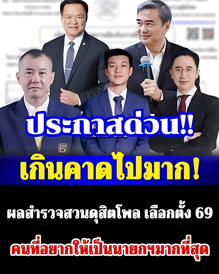 สวนดุสิตโพล” มหาวิทยาลัยสวนดุสิต ส ารวจความคิดเห็นประชาชนทั่วประเทศ เรื่อง “นโยบายกับพรรคการเมืองใน การเลือกตั้ง 69” กลุ่มตัวอย่าง จานวน 2,586 คน (สารวจทางออนไลน์และภาคสนาม) ระหว่างวันที่ 13-16 มกราคม 2569 พบว่า พรรคประชาชนถือเป็นพรรคที่มีความได้เปรียบมากที่สุดถึง 4 นโยบาย คือ ด้านการเมืองและความมั่นคง ร้อยละ 38.14 ด้านการศึกษา ร้อยละ 43.93 ด้านการเกษตร ร้อยละ 35.82 และด้านการแก้ปัญหาทุจริตคอร์รัปชัน ร้อยละ 39.89 ส่วนพรรค เพื่อไทยมีความได้เปรียบ 1 นโยบาย คือ ด้านปากท้อง/ค่าครองชีพ ร้อยละ 35.63 ทั้งนี้ถ้ามีการเลือกตั้ง กลุ่มตัวอย่างจะเลือก พรรคประชาชน ร้อยละ 34.11 รองลงมาคือ เพื่อไทย ร้อยละ 18.37 และเลือก สส.เขตสังกัดพรรคประชาชน ร้อยละ 33.14 รองลงมาคือ เพื่อไทย ร้อยละ 19.49 โดยบุคคลที่อยากให้เป็นนายกรัฐมนตรีคนต่อไป คือ ณัฐพงษ์ (ปชน.) ร้อยละ 34.34 ยศชนัน (พท.) ร้อยละ 19.91 และอนุทิน (ภท.) ร้อยละ 16.13
